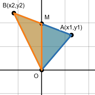 この点を \(M=(0,-\frac{y_1-y_2}{x_1-x_2}x_1+y_1)\) とし、三角形\(AOM\)と三角形\(BOM\)の面積をそれぞれ \(|\triangle AOM|\) と \(|\triangle BOM|\) とおきます。このとき